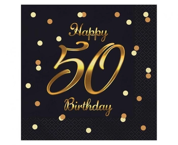 Serwetki Happy 50 Birthday, czarne, nadruk złoty, certyfikat FSC, 33x33 cm/ 20 szt.