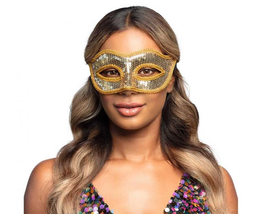 Maska wenecka na oczy wykonana z tworzywa sztucznego, pokryta złotymi cekinami. 1 sztuka, producent Boland. Przeznaczona do użycia jako element stroju lub dekoracji na wesela, wieczory panieńskie, karnawał, Halloween, urodziny, baby shower i sesje zdjęciowe.