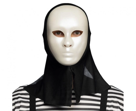 Biała maska mima z kapturem to praktyczny element przebrania na bale, karnawał, wieczory tematyczne, sesje zdjęciowe i występy sceniczne. Składa się z plastikowej maski połączonej z kapturem z poliestru; rozmiar uniwersalny, 1 sztuka w opakowaniu, producent: Boland.