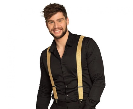 Złote szelki Boland to regulowany dodatek dla dorosłych (od 14 lat), wykonany z tworzywa sztucznego. Długość 75 cm, szerokość 3,5 cm, zapinane na klipsy. Przeznaczone do strojów i kostiumów na wesela, wieczory tematyczne, karnawał oraz sesje zdjęciowe.