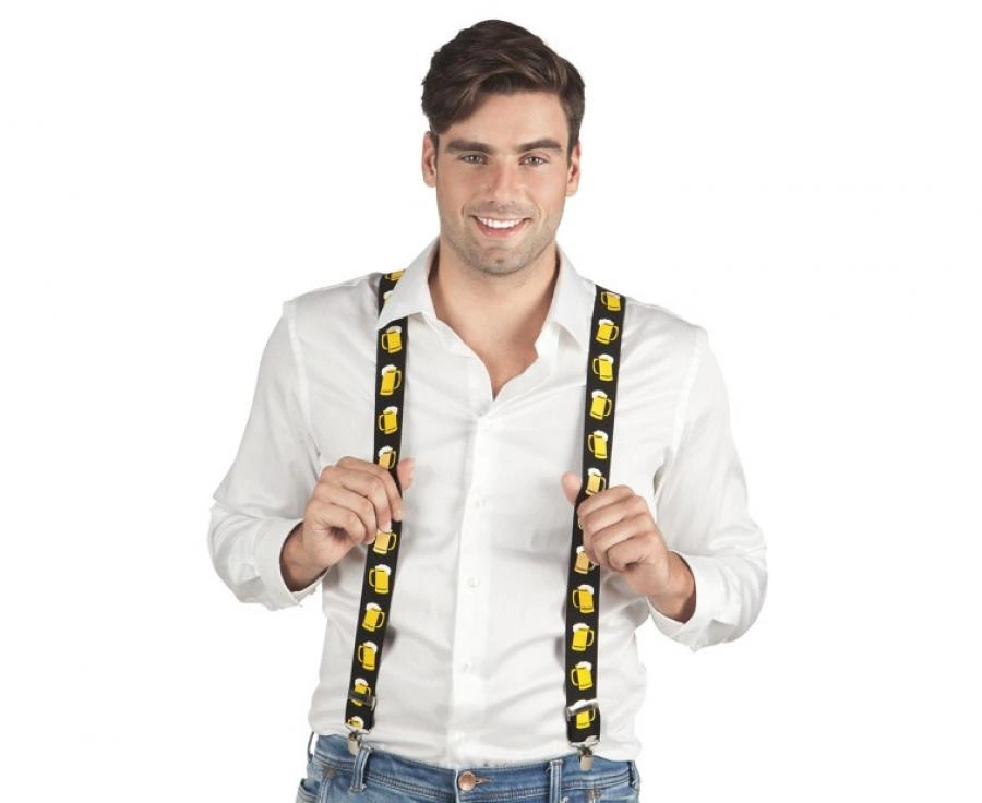 Motyw kufli piwa • Regulowane szelki uniwersalne • Szerokość 3,5 cm • Idealne na kawalerski • Wyróżnij się na imprezie