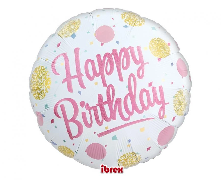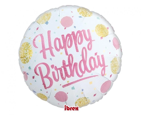 35 cm • 1 szt. w opakowaniu • Napełnienie helem • Wzór: Happy Birthday Gold&Pink Dots • Wielorazowe