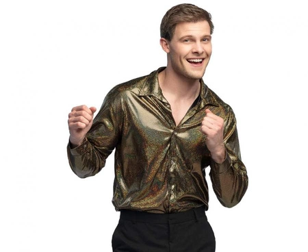 Złota koszula Shiny w rozmiarze XXL, wykonana z poliestru, 1 sztuka. Błyszczące wykończenie i prosty krój sprawdzają się na imprezy kostiumowe, wieczory panieńskie, karnawał, sylwestra czy sesje zdjęciowe. Łatwo łączy się z dodatkami i akcesoriami scenograficznymi.