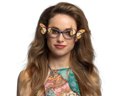 Okulary damskie Party Motyl to lekki gadżet imprezowy z tworzywa sztucznego, w wielokolorowym wzorze motyli. Pojedyncza sztuka producenta Boland przeznaczona na wieczory panieńskie, urodziny, baby shower i inne przyjęcia — jako element stroju oraz rekwizyt do zdjęć.