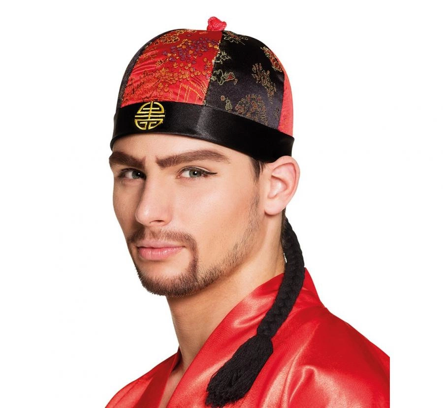 Czapka chińska z włosami to kostiumowy dodatek w uniwersalnym rozmiarze, dostępny w czerwonym i czarnym kolorze. Wykonana z poliestru (materiał podobny do satyny) z ozdobnym obszyciem i przyszytym warkoczem; najlepiej sprawdzi się na imprezach tematycznych, karnawale i sesjach zdjęciowych.