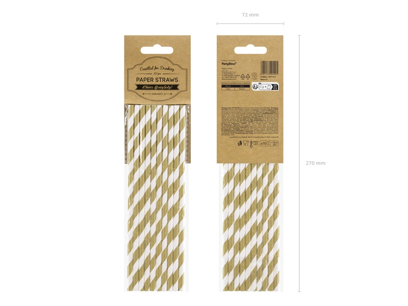 - Słomki papierowe w kolorze złotym z białymi ukośnymi paskami, długość około 19,5 centymetra. (1 op. / 10 szt.)