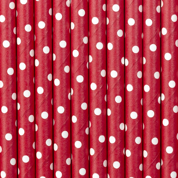 - Słomki papierowe w kolorze czerwonym z białymi małymi kropkami, długość około 19,5 centymetra. (1 op. / 10 szt.)