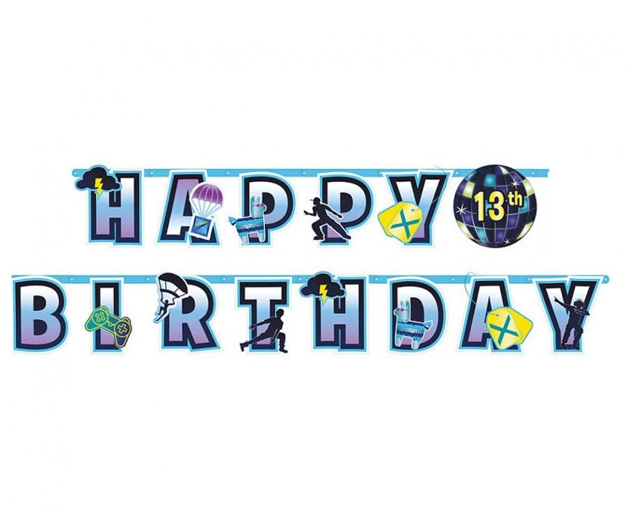 Banner urodzinowy „Battle Royal” inspirowany grą Fortnite, w rozmiarze 320×26 cm, wykonany z papieru w odcieniach fioletu i niebieskiego. Zadrukowany napisem „Happy Birthday”. Najlepiej sprawdzi się na urodzinach nastolatków, przyjęciach tematycznych i jako tło do zdjęć; lekki materiał ułatwia szybki montaż i demontaż.