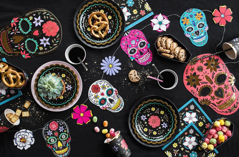 - Stylowy design w czarnym kolorze z białymi kropkami, który pasuje do wielu tematów imprezowych.
