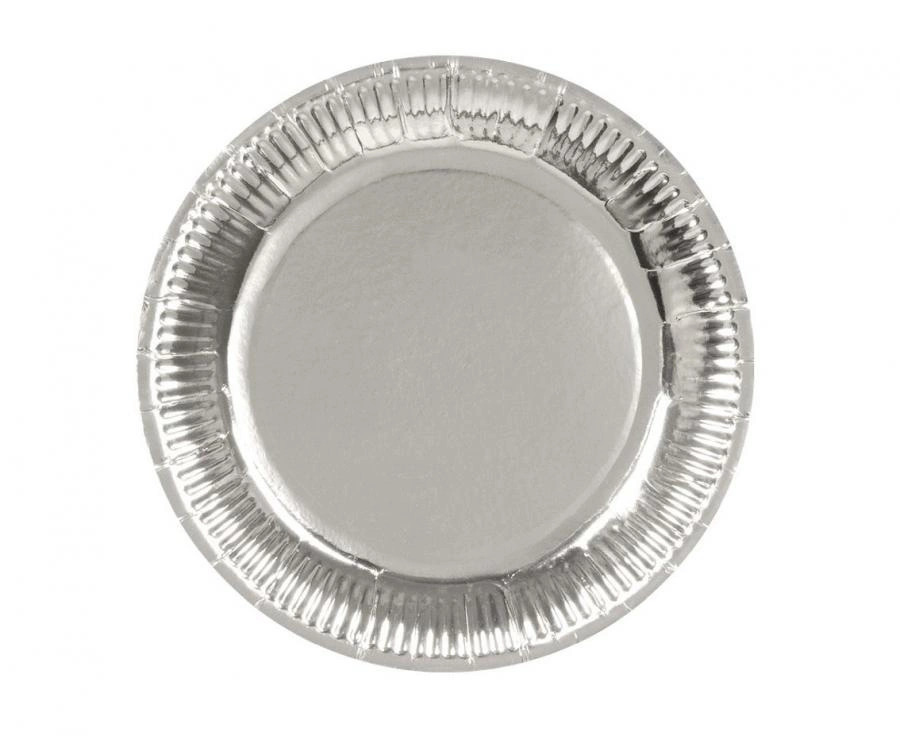6 szt. w opakowaniu • okrągły kształt • idealne na imprezy • elegancki srebrny kolor • 23 cm średnicy