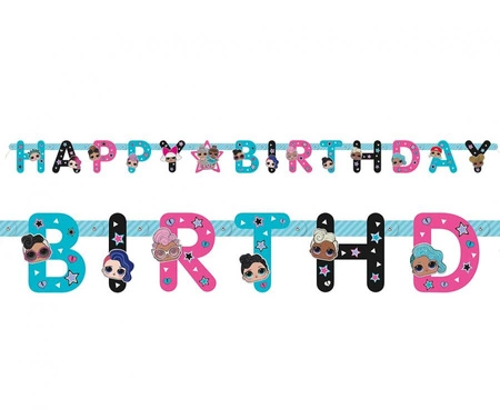 Girlanda papierowa "HAPPY BIRTHDAY" z motywem LOL SURPRISE, długość 1,82 m. Jedna sztuka w opakowaniu, wykonana z papieru, w różnokolorowej grafice. Przeznaczona przede wszystkim na urodziny dzieci i imprezy tematyczne jako dekoracja ściany, stołu lub tła do zdjęć.