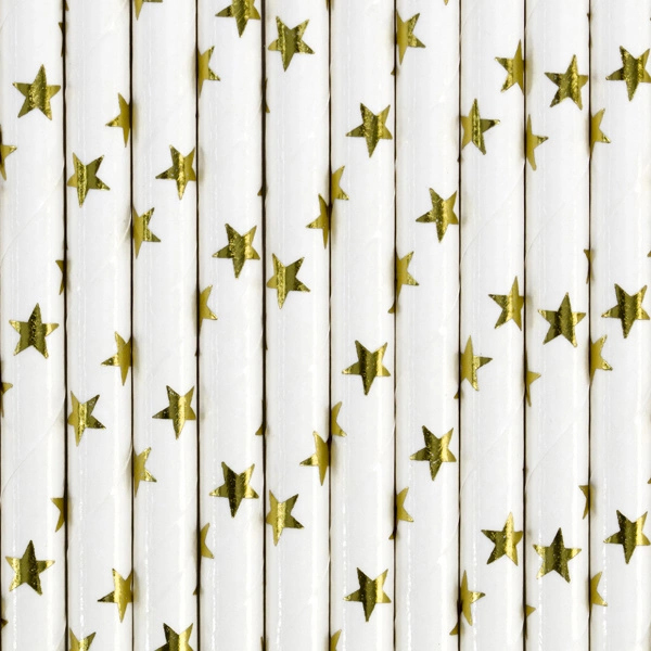 - Słomki papierowe w kolorze białym, ze złotymi metalizowanymi gwiazdkami, długość ok. 19.5 cm. Towar nie może być sprzedawany na terytorium RFN i Szwajcarii, w związku z wewnętrznymi regulacjami prawnymi Niemiec i Szwajcarii. Towar zgodny z przepisami Unii