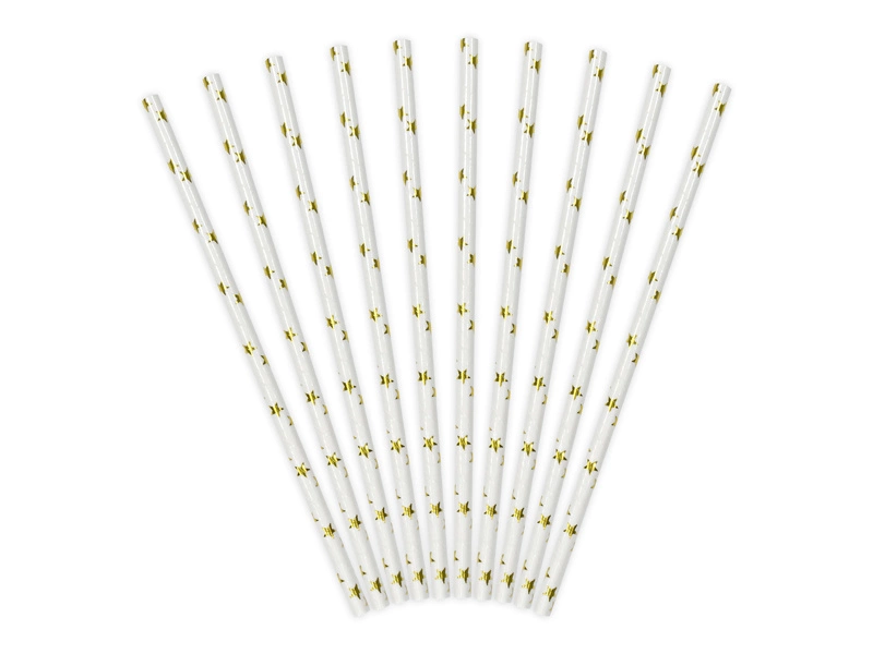 Rozświetl swoją imprezę z naszymi stylowymi słomkami papierowymi w kolorze białym, ozdobionymi złotymi metalizowanymi gwiazdkami. Te eleganckie słomki są idealne na każdą okazję, od wesel po wieczory panieńskie, dodając wyjątkowego uroku każdemu napojowi.