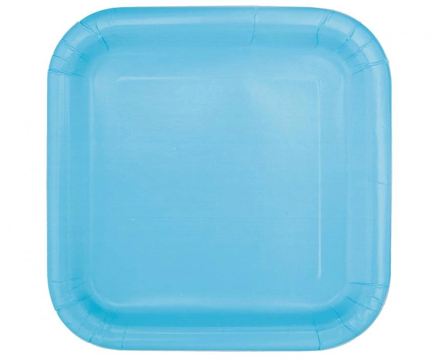 Jasnoniebieskie, kwadratowe talerzyki papierowe Unique Party o wymiarach 23 x 23 cm (14 szt. w opakowaniu). Produkt przeznaczony do serwowania ciast, przekąsek i kanapek na przyjęciach takich jak baby shower, wieczór panieński, urodziny, czy imprezy sezonowe.
