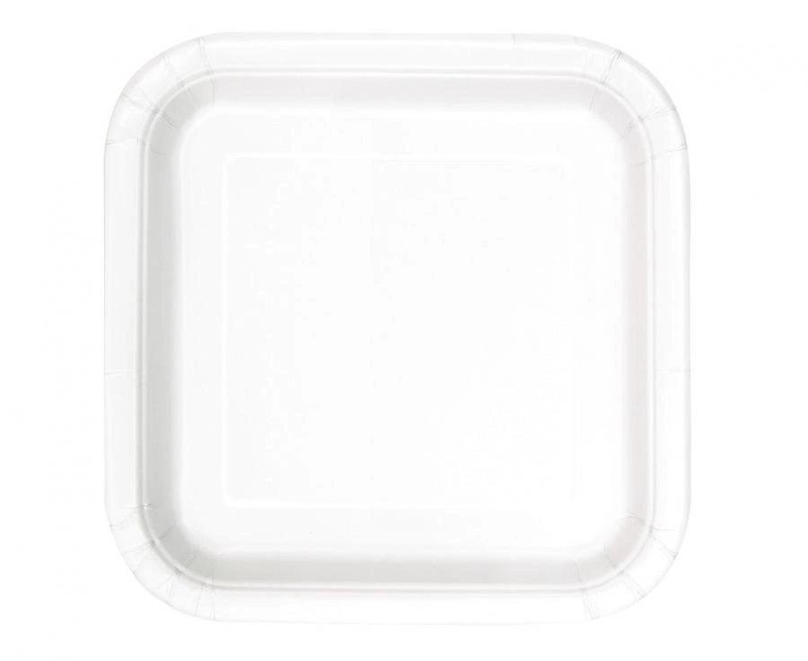 Kwadratowe talerzyki papierowe 23 x 23 cm, 14 szt. (Unique Party). Wykonane w 100% z papieru, w białym kolorze. Przeznaczone do serwowania przekąsek, ciast i kanapek na wesela, urodziny, baby shower, wieczory panieńskie oraz inne przyjęcia. Lekka konstrukcja ułatwia serwowanie i sprzątanie.
