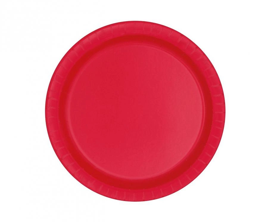 Talerzyki papierowe czerwone o średnicy 18 cm, zestaw 8 sztuk. Przeznaczone do jednorazowego serwowania deserów, przekąsek i małych porcji na przyjęciach takich jak urodziny, wieczór panieński, Walentynki czy Boże Narodzenie. Wykonane z papieru — łatwe w użyciu i utylizacji.