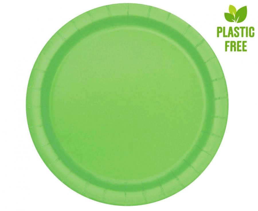 Talerzyki papierowe limonkowe o średnicy 23 cm, 8 sztuk w opakowaniu. Wykonane w 100% z papieru, okrągłe, bez nadruku i bez plastiku — przeznaczone do serwowania przekąsek, ciast i dań podczas urodzin, baby shower, wieczoru panieńskiego, świąt czy imprez tematycznych.