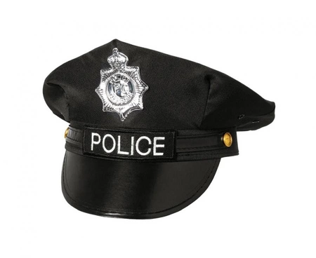 Czarna czapka policjanta dla dorosłych, rozmiar uniwersalny (obwód 58 cm), materiał poliester, 1 szt. Produkt firmy Boland. Przeznaczona do kostiumów i przebrań na imprezy tematyczne: wieczór panieński, Halloween, urodziny, sesje zdjęciowe. Łatwa w użyciu.