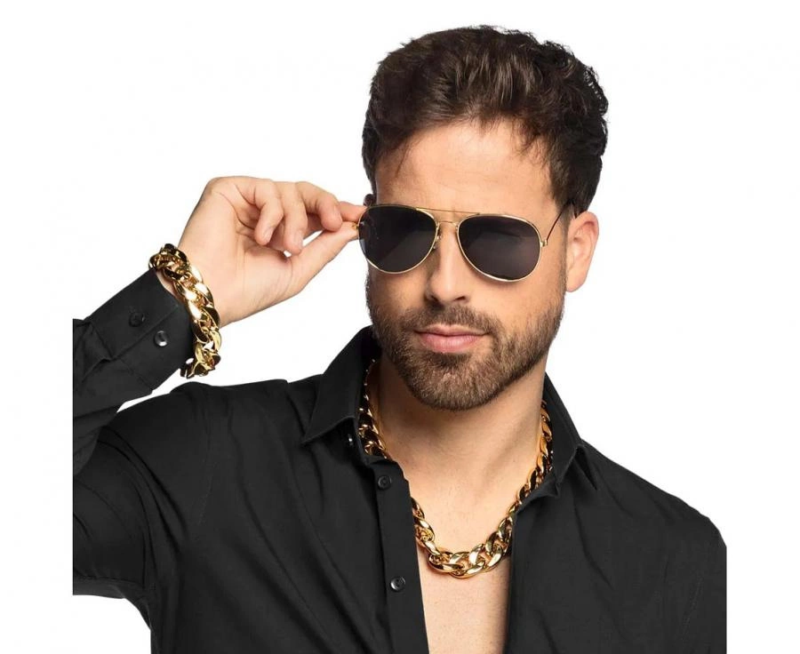 Zestaw dla dorosłych „Pimp” zawiera naszyjnik, bransoletę i okulary w kolorach czarnym i złotym. Akcesoria wykonano z plastiku; są lekkie i łatwe do założenia. Produkt przeznaczony na tematyczne imprezy dla dorosłych: wieczory panieńskie, Halloween, karnawał oraz imprezy kostiumowe.