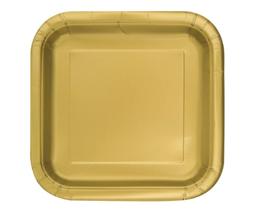 Talerzyki papierowe złote, okrągłe o średnicy 18 cm, 16 sztuk w opakowaniu. Przeznaczone do serwowania deserów, przekąsek i finger food na takich okazjach jak wesele, wieczór panieński, urodziny, baby shower, Walentynki, Boże Narodzenie czy Halloween. Wykonane w 100% z papieru, bez nadruku.