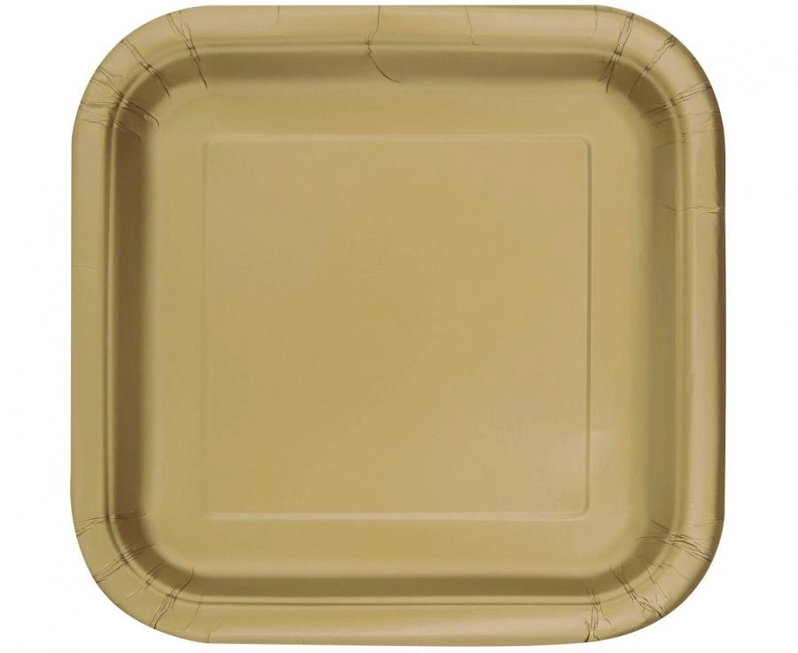 Kwadratowe talerzyki papierowe w kolorze złotym, 23 x 23 cm, 14 sztuk. Przeznaczone do serwowania przekąsek, ciast i deserów podczas wesel, urodzin, baby shower i wieczorów panieńskich. Jednorazowe, lekkie i łatwe do ustawienia na stole oraz wykorzystania jako tło do zdjęć.