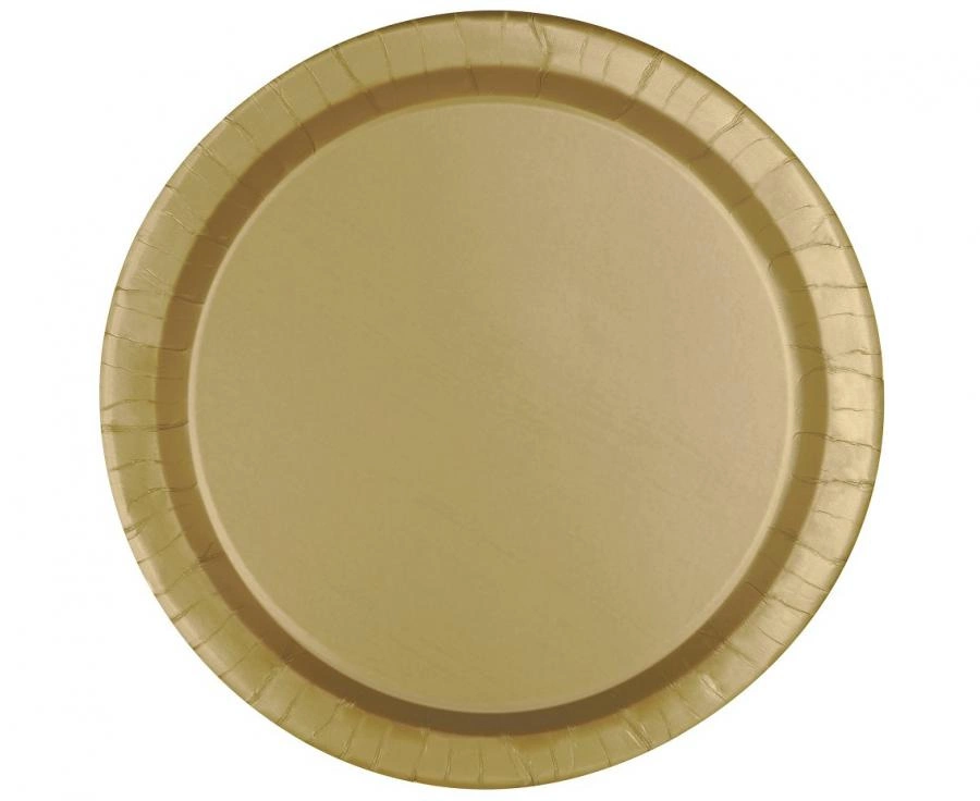 Złote talerzyki papierowe Unique Party o średnicy 18 cm, 8 sztuk w opakowaniu. Wykonane w 100% z papieru, okrągłe — przeznaczone do serwowania przekąsek, deserów i porcji bufetowych na wesela, urodziny, baby shower, wieczory panieńskie i świąteczne stoły. Jednorazowe, łatwe w użyciu i utylizacji.