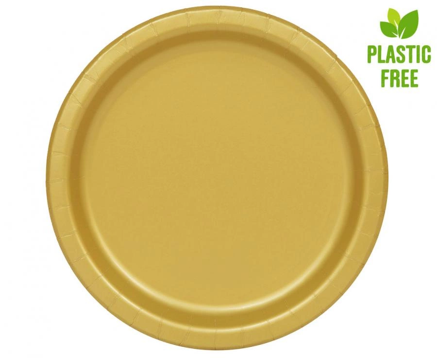 Złote papierowe talerzyki o średnicy 23 cm, 16 szt. w opakowaniu. Wykonane w 100% z papieru (plastic-free), okrągłe, bez nadruku. Nadają się do serwowania dań ciepłych i zimnych podczas wesela, urodzin, baby shower oraz innych przyjęć tematycznych.