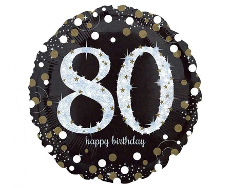 Balon foliowy 18" Sparkling Birthday 80 to okrągły balon o średnicy 46 cm, w kolorach czarnym i srebrnym, z nadrukiem "Happy Birthday" i cyfrą 80. Przeznaczony do napełnienia helem; nadaje się na 80. urodziny jako samodzielna dekoracja, element tła do zdjęć lub uzupełnienie aranżacji stołu.