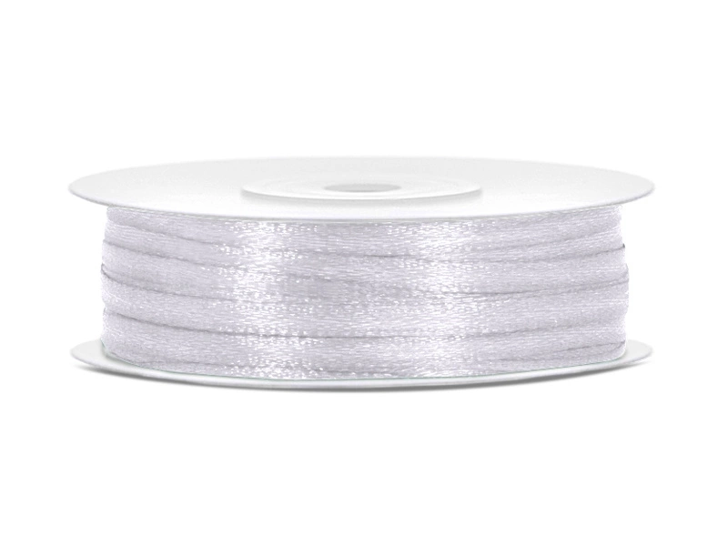 - Tasiemka satynowa w kolorze białym, szerokość 3 milimetry, długość 50 metrów. (1 szt. / 50 mb.)