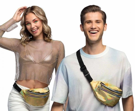 Złota nerka Laura Biaggi wykonana ze skóry ekologicznej, zapinana na suwak. Jedna komora z wewnętrzną kieszonką na zamek, odpinany i regulowany pasek (max 110 cm). Wymiary 24×15×5 cm, producent Boland. Praktyczna do noszenia na biodrze lub crossbody — odpowiednia na wesele, wieczór panieński, urodziny i imprezy tematyczne.