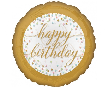 Balon foliowy 18" (46 cm) Pastel Confetti z napisem "Happy Birthday" od producenta Amscan. Okrągły balon w kolorach złotym i białym, sprzedawany w opakowaniu 1 szt. Przeznaczony do napełnienia helem — po napełnieniu powietrzem nie będzie się unosić. Nadaje się na urodziny jako dekoracja stołu lub tła fotograficznego.