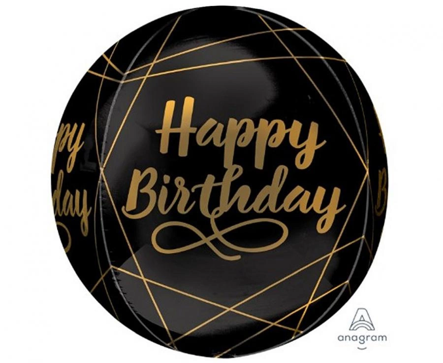 Balon foliowy ORBZ — kula o średnicy 16 cali (≈40 cm) w kolorze czarnym z nadrukiem „Happy birthday”. Produkt od Anagram, przeznaczony na urodziny, wieczór panieński, baby shower i dekoracje tematyczne. Można napełnić helem (unosi się) lub powietrzem jako element aranżacji.