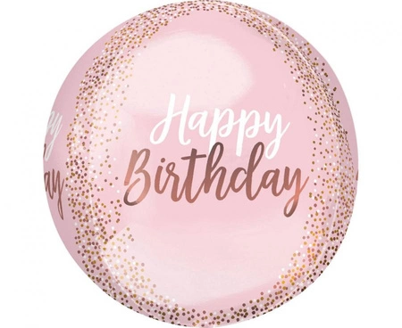 Foliowy balon ORBZ Kula Rose Gold Blush o wymiarach 38 x 40 cm (ok. 15 x 16 cali) z nadrukiem „happy birthday”. Sferyczny balon w różowo-złotym odcieniu przeznaczony głównie na przyjęcia urodzinowe — sprawdzi się jako pojedynczy akcent dekoracyjny lub element bukietu balonów.