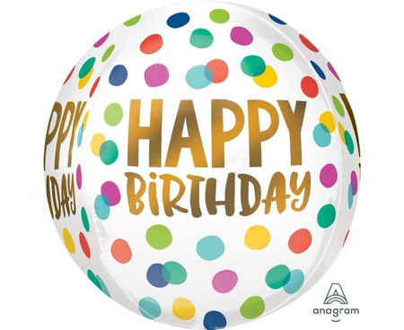 Balon foliowy ORBZ Happy Dots to okrągły balon foliowy (mylar) z nadrukiem „Happy Birthday”. W opakowaniu znajduje się 1 sztuka, producent Anagram. Produkt przeznaczony jest do napełnienia helem — przy napełnieniu powietrzem nie będzie się unosił. Najlepszy na urodziny i jako tło do zdjęć.