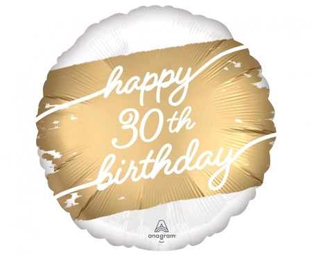 Balon foliowy 18" Golden age 30 to okrągły balon o średnicy 46 cm (18"), w kolorach biało‑złotym z nadrukiem "Happy 30th birthday". Przeznaczony do dekoracji 30. urodzin — sprawdzi się jako element tła fotograficznego, aranżacji stołu lub pojedynczy akcent dekoracyjny przyjęcia.