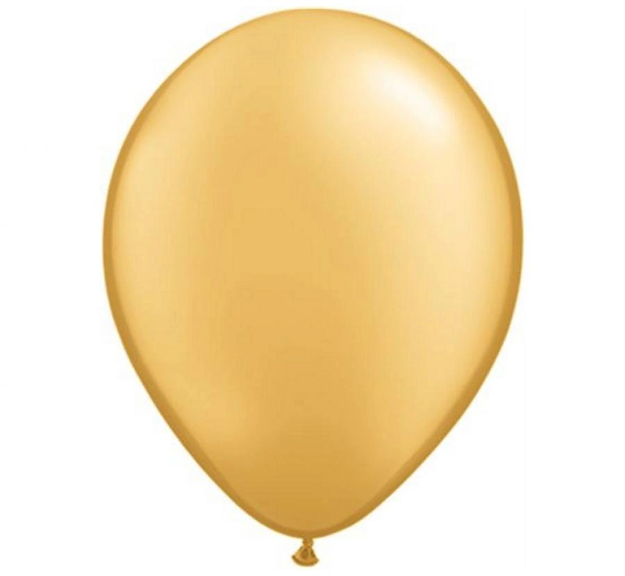 Balony lateksowe metaliczne, kolor złoty, rozmiar 11" (ok. 28 cm), opakowanie 100 sztuk. Przeznaczone do napełnienia helem — po napełnieniu powietrzem nie będą się unosić. Brak nadruku; producent: Qualatex. Nadają się na wesele, urodziny, baby shower i inne przyjęcia.