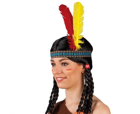 Opaska Indiańska Lonato to uniwersalna opaska na głowę dla dorosłych, ozdobiona dużymi piórami w kolorach żółtym i czerwonym. Przeznaczona do przebierań, tematycznych imprez, wieczorów panieńskich, Halloween czy sesji zdjęciowych — jako element kostiumu, fryzury lub akcent stylizacji.