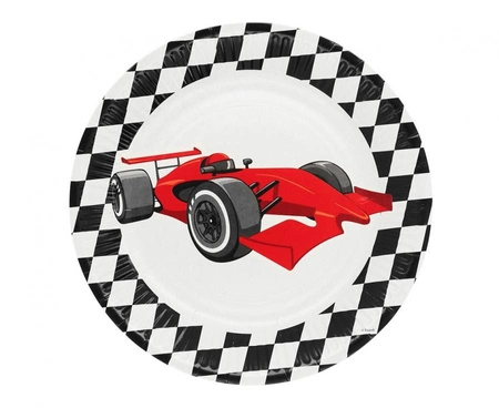 Papierowe talerzyki Racing o średnicy 23 cm, 8 sztuk w opakowaniu, z nadrukiem czarno-białych elementów przypominających flagę wyścigową i czerwoną wyścigówką. Przeznaczone na przyjęcia tematyczne: urodziny fanów motoryzacji, wieczór panieński z motywem racing, baby shower o tematyce samochodów czy imprezy dla dzieci.
