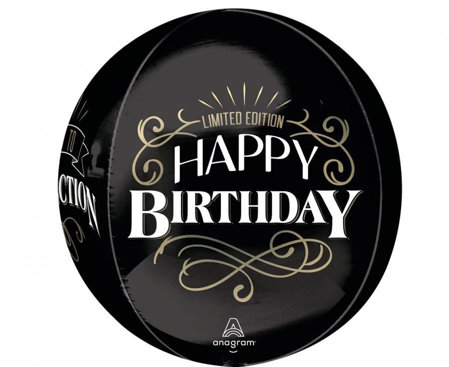 Balon foliowy ORBZ "Better with age" to kulisty balon o średnicy 53 cm z nadrukiem "Happy Birthday" w kolorach czarnym, złotym i białym. Produkt w opakowaniu 1 szt., wykonany z folii przez producenta Anagram. Przeznaczony do napełnienia helem; przy napełnieniu powietrzem nie będzie się unosić.