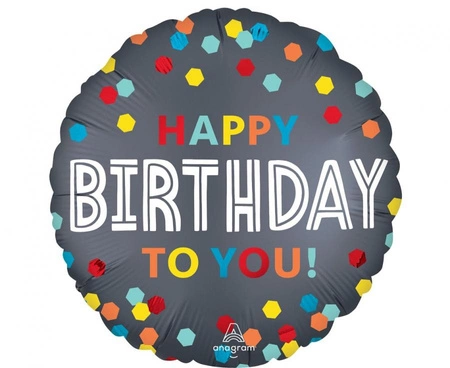 Balon foliowy 18" (46 cm) z nadrukiem „Happy Birthday” od Anagram — okrągły, wielokolorowy motyw konfetti. Przeznaczony na przyjęcia urodzinowe; można napełnić helem lub powietrzem. Wysyłany pusty (1 sztuka). Balon nie unosi się, jeśli jest napełniony powietrzem.
