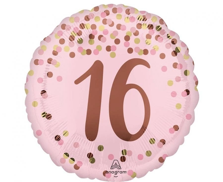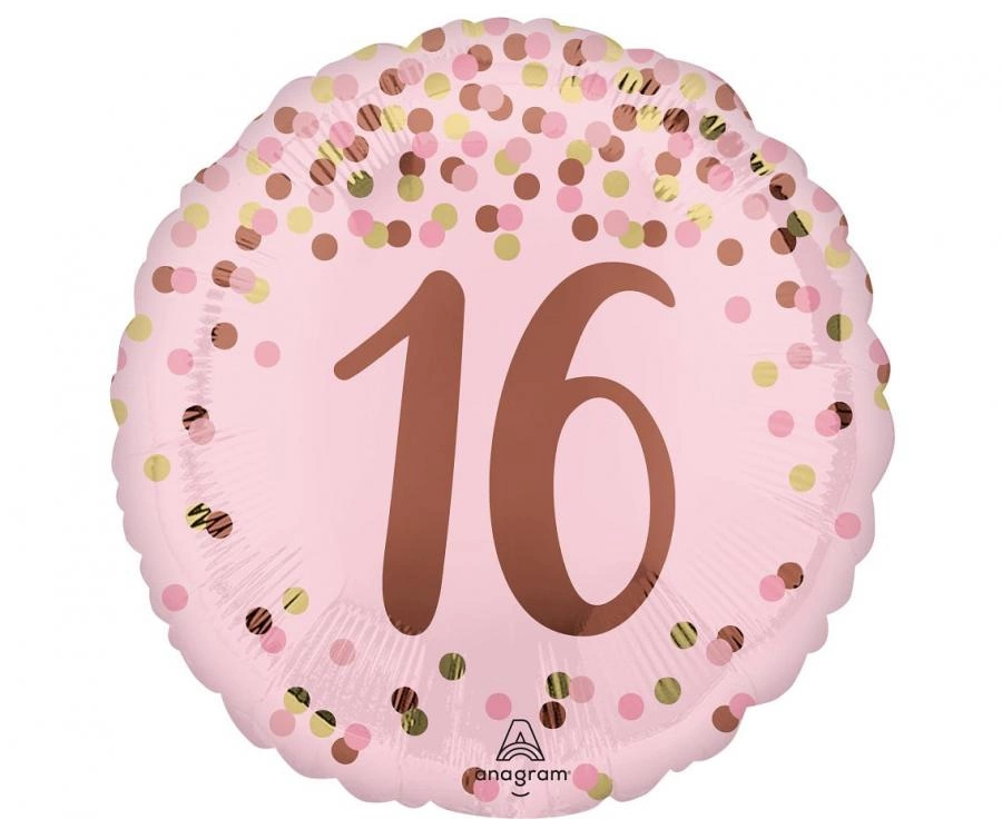 Balon foliowy 18" (46 cm) w kolorze różowym z nadrukiem liczby 16, producent Anagram. Okrągły balon, opakowanie zawiera 1 sztukę; sprzedawany bez napełnienia. Przeznaczony do napełnienia helem lub powietrzem — przy napełnieniu helem unosi się, przy powietrzu nie. Nadaje się na 16. urodziny jako dekoracja tła lub stołu.