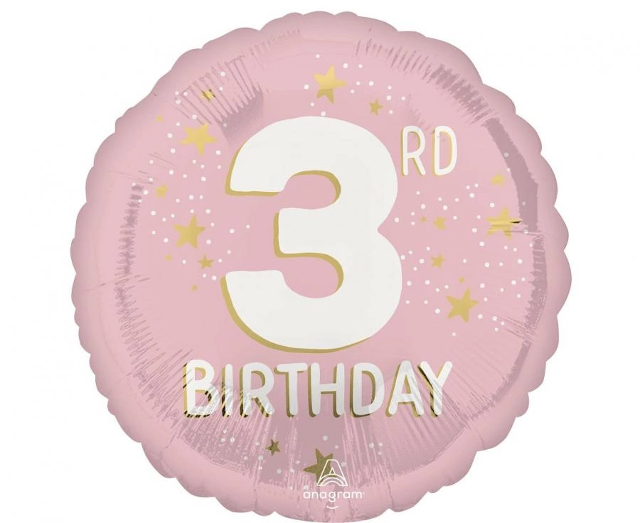 Balon foliowy Anagram 18" (46 cm), różowy, z nadrukiem cyfry 3 — przeznaczony na 3. urodziny. Okrągły balon, 1 sztuka w opakowaniu. Można napełnić helem (będzie się unosić) lub powietrzem (wówczas nie unosi się). Balon nie jest napełniony w opakowaniu. Sprawdza się w bukietach balonowych, jako dekoracja stołu lub tło do zdjęć.