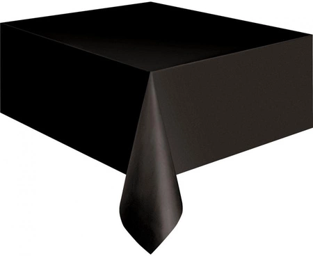Obrus czarny z tworzywa (plastik) o wymiarach 137 x 274 cm. Przeznaczony na stoły prostokątne podczas wesel, wieczorów panieńskich, urodzin, baby shower, Halloween, Bożego Narodzenia czy Walentynek. Chroni blat przed plamami i ułatwia sprzątanie po imprezie.
