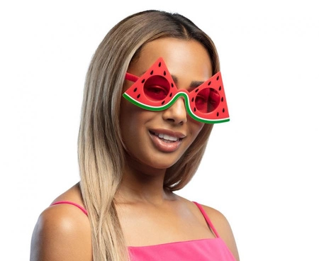Okulary Arbuz to plastikowe okulary imprezowe z czerwonymi szkłami w kształcie kawałków arbuza. Rozmiar uniwersalny (szer. oprawki ok. 13 cm, szkła 8×8 cm), pasują większości dorosłych i dzieci. Nadają się na urodziny, wieczór panieński, baby shower, Halloween i Walentynki.