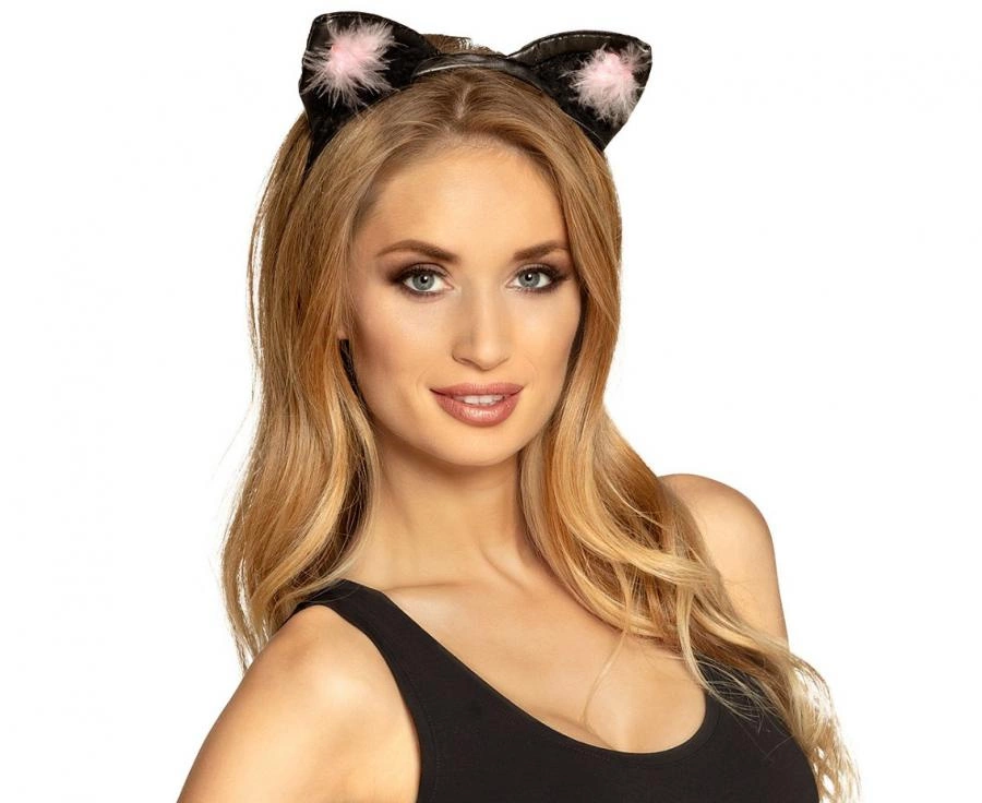 Opaska Kotek Różowy Puszek to elastyczna, uniwersalna opaska z uszami kota (wysokość uszu ok. 7 cm) w kolorach czarnym i różowym oraz z różowym puszkiem. Produkt marki Boland, 1 sztuka. Przeznaczona na przebrania, wieczory panieńskie, urodziny, baby shower i sesje zdjęciowe.