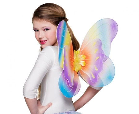 Skrzydła Irys, wielokolorowe, 40 x 44 cm – pojedynczy element kostiumu od producenta Boland. Przeznaczone do wykorzystania jako części przebrania lub rekwizyt na imprezy tematyczne: urodziny, wieczór panieński, baby shower, Halloween, sesje zdjęciowe i inne okazje, gdzie potrzebny jest kolorowy akcent stroju.