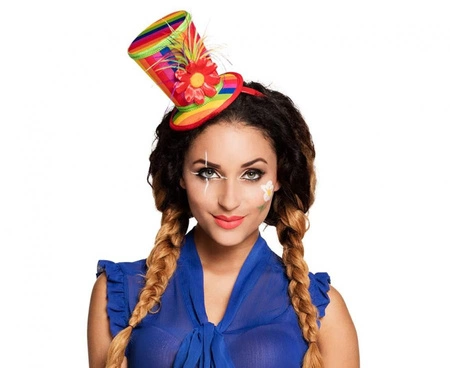Opaska do włosów Blossom z mini kapeluszem klauna to wielokolorowy, lekki dodatek wykonany z poliestru. W rozmiarze uniwersalnym sprawdzi się na imprezy tematyczne: Halloween, wieczór panieński, urodziny i sesje zdjęciowe jako szybki element przebrania.