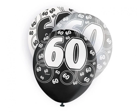 Balony 12" Glitz z nadrukiem "60" to zestaw 6 balonów o średnicy około 30 cm w kolorach czarnym, srebrnym i białym. Przeznaczone głównie na 60. urodziny lub 60. rocznicę; sprawdzą się jako element girland, bukietów balonowych oraz tła do zdjęć.