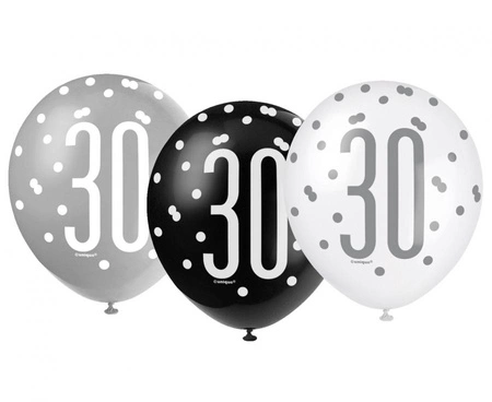 Balony 12" Glitz z nadrukiem liczby 30 i wzorem groszków — zestaw 6 sztuk w miksie kolorów: czarny, srebrny i biały. Po napompowaniu mają ok. 30 cm średnicy. Można je napełnić powietrzem lub helem; pasują do dekoracji urodzin, jubileuszy i tematycznych przyjęć.