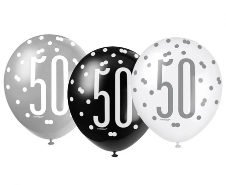 Balony lateksowe 12" (ok. 30 cm) z nadrukiem liczby 50 i wzorem groszków. Opakowanie zawiera 6 sztuk w miksie kolorów: czarny, srebrny i biały. Można je napełnić powietrzem lub helem. Przeznaczone głównie na 50. urodziny i jubileusze, sprawdzą się też w zestawieniach dekoracyjnych.